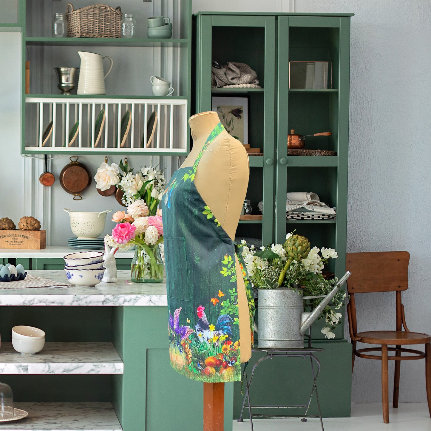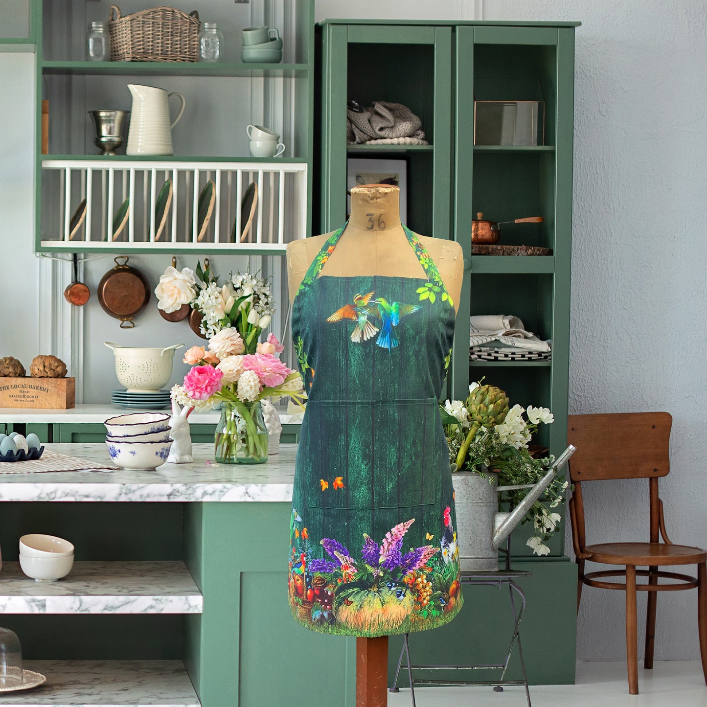 This "Birds in Paradise" Apron is adorned with a flurry of avian activity amongst verdant produce on a dark green background.