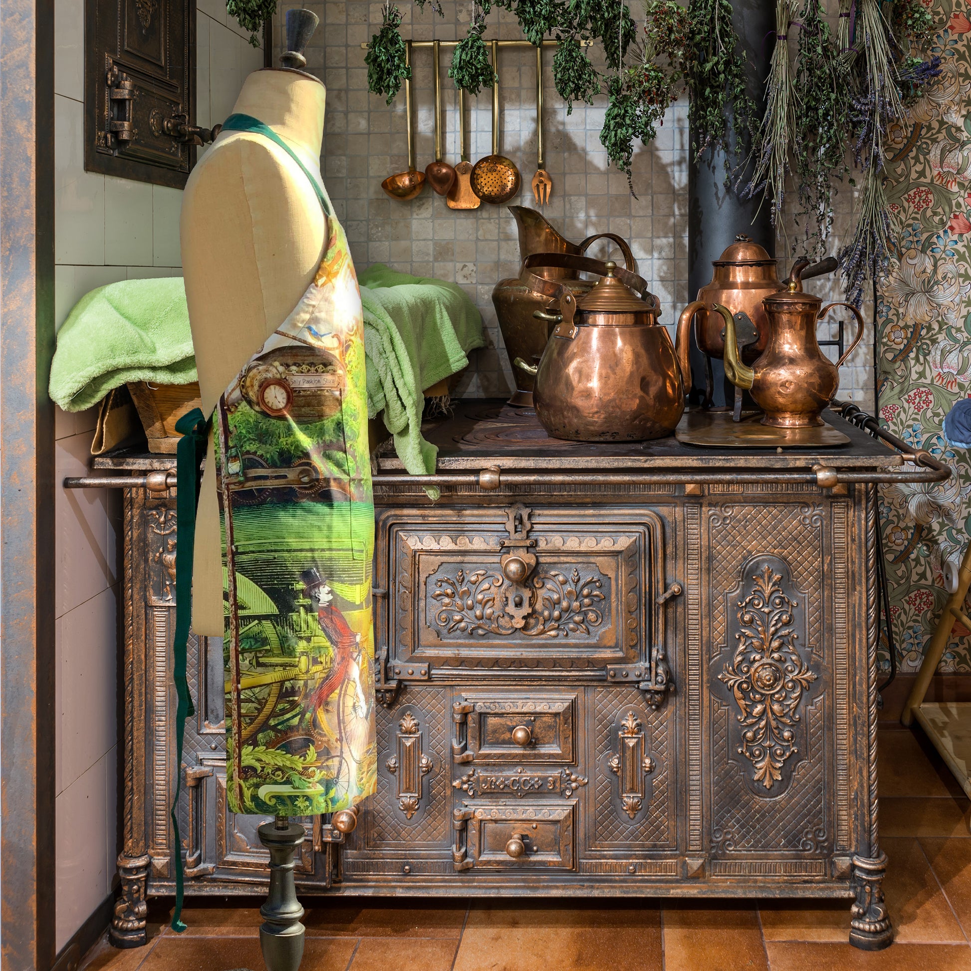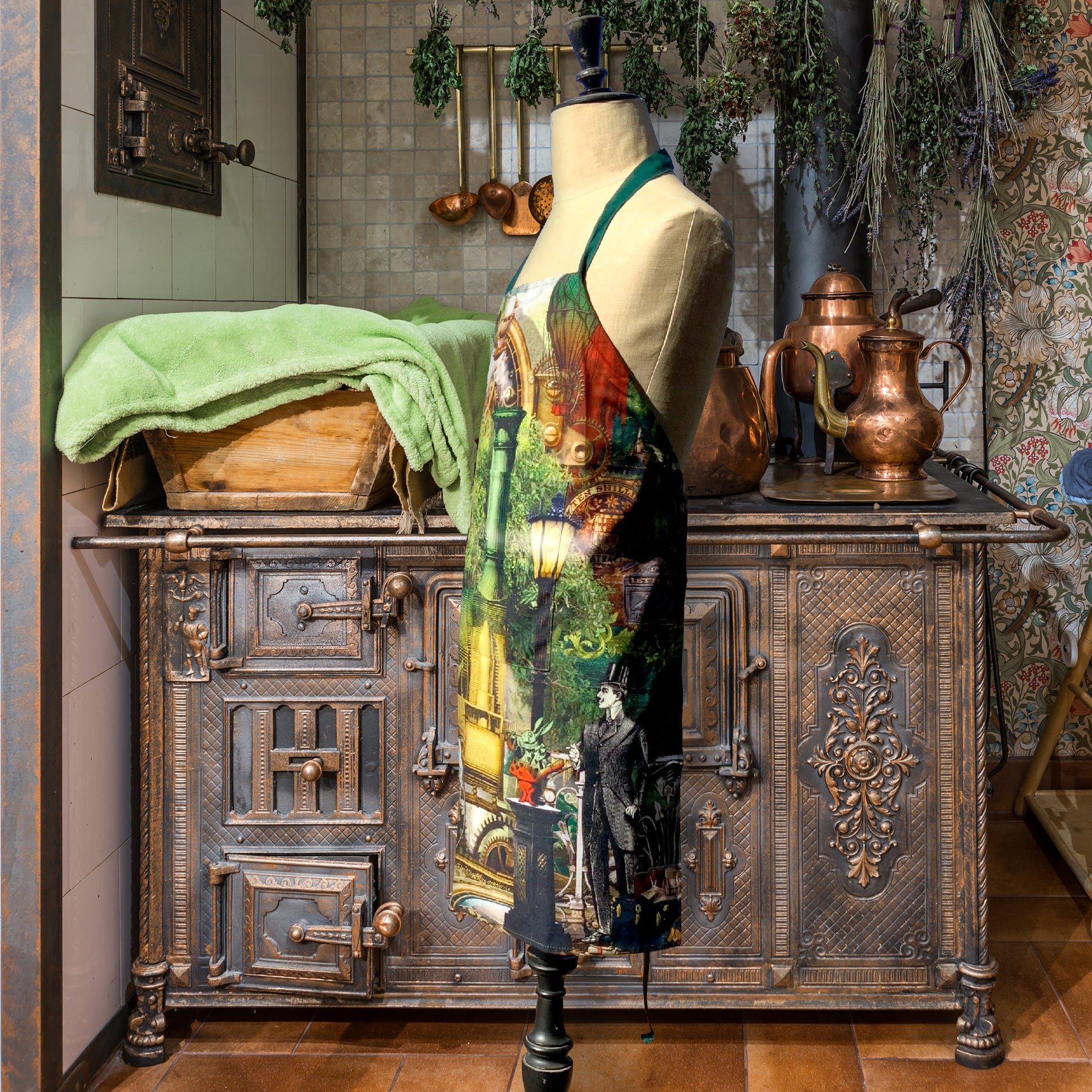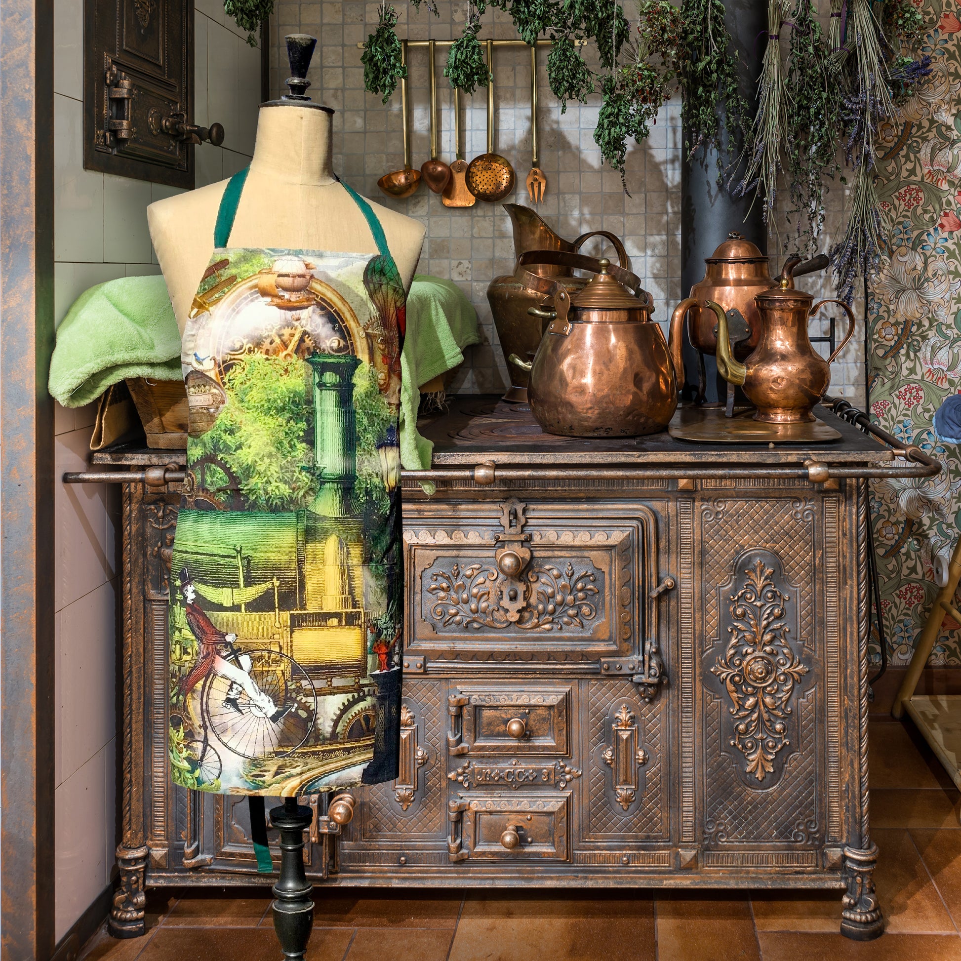 Sally's Station Apron is inspired by the age of steam and invention, its design evokes the grandeur of a bustling railway station where gears turn, wheels spin and stories begin. Golden cogs and brass-like details mingle with lush greenery, while a whimsical cyclist nods to the romance of bygone travel. The deep green straps echo the hues of old trains balancing practicality with artistry. Perfect for the kitchen, garden or studio, this apron transforms daily tasks into a journey through time.