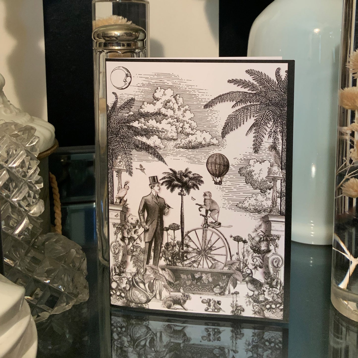 The "Monkey Business"Gift Card is an elegant monochrome ecelctic mix of Victorian exotica with a touch of steampunk.