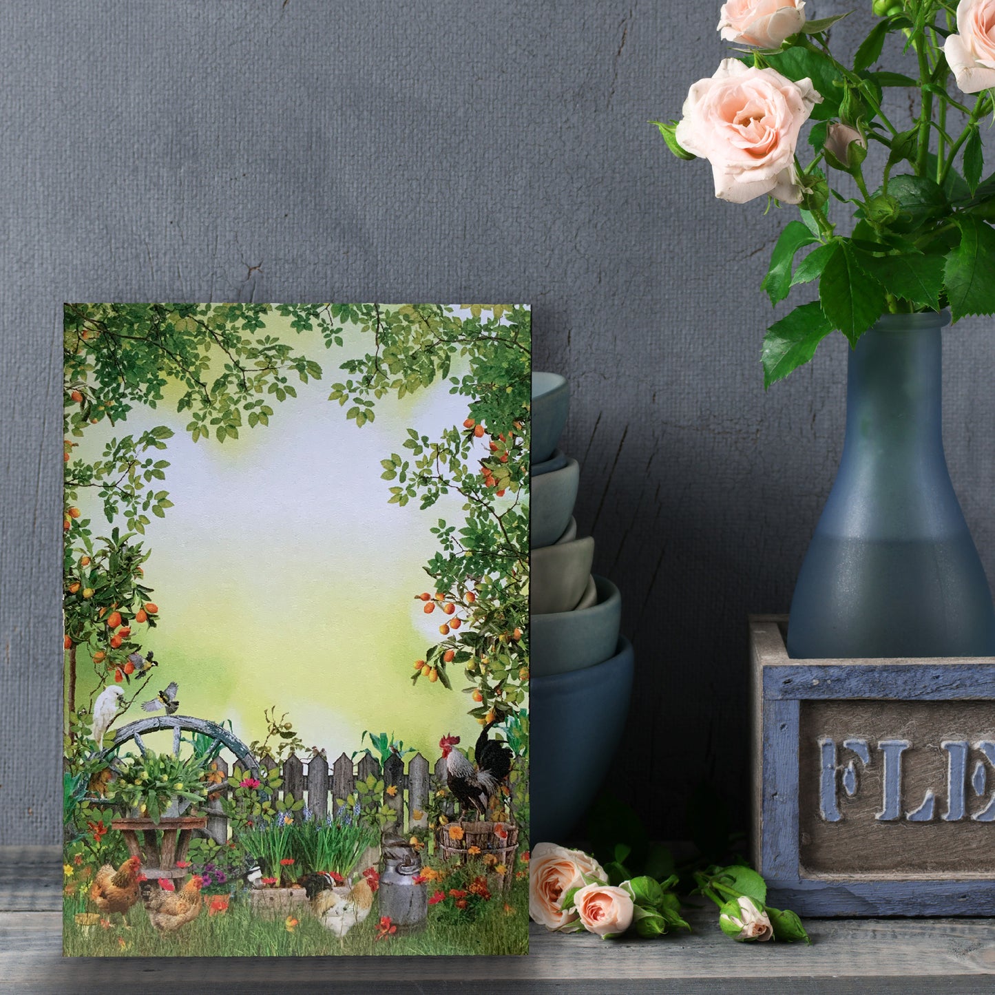 "Orchard Picnic" Gift Card exudes country charm amid backyard bustle.