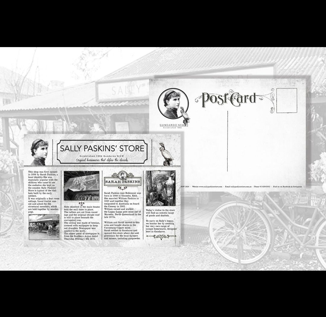 An informative souvenir of your visit to Sally Paskin's Store. This beautiful card gives an insight to one our fascinating and adventurous pioneer ladies. From England to the North Queensland gold fields and successful career in local commerce in the picturesque village of Gundaroo.