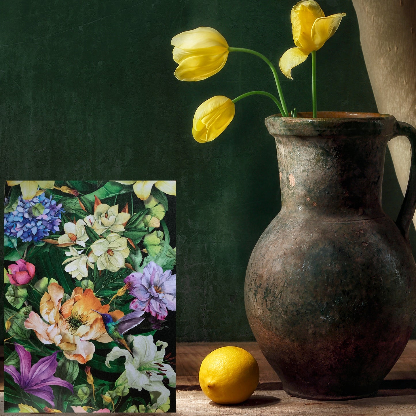 The "Tropical Splash" Gift Card is bursting with colorful flowers against a background of dark green foliage.