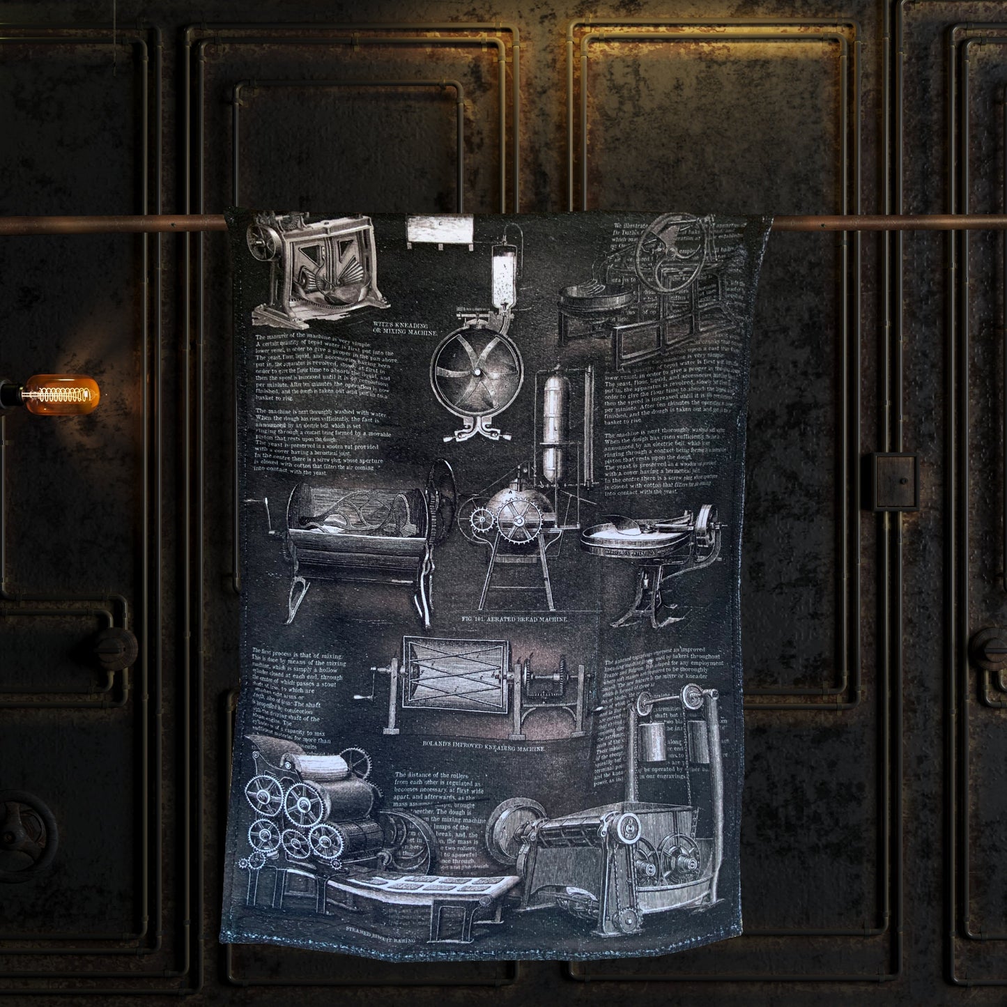 "Dough Re Mi" microfibre hand towel features a blackboard background with an array of fascinating early bakery machinery that was produced over a 100 years ago. This design has a definite nod to steampunk.