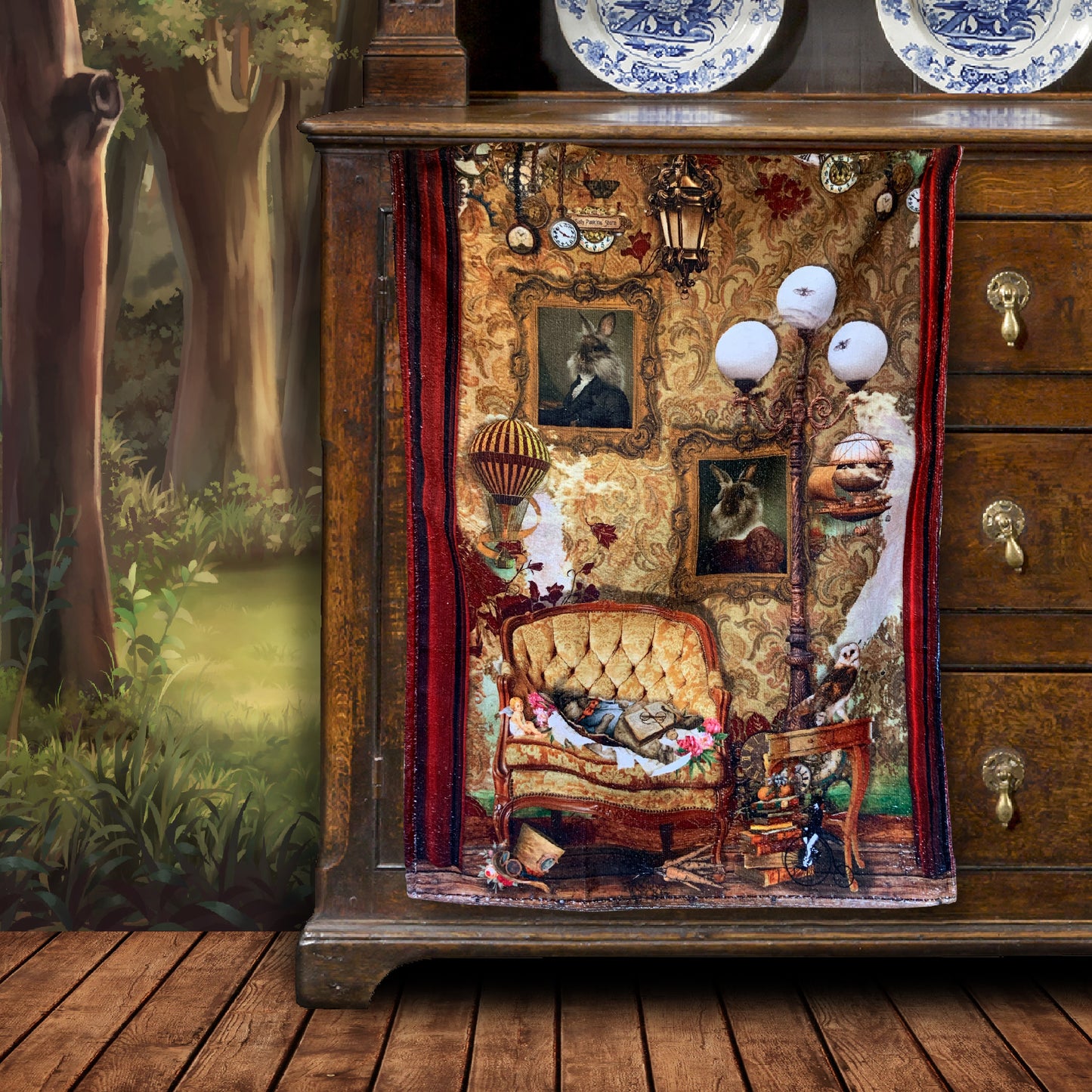 "The Sleeping Rabbit" Microfibre Hand Towel features a glimpse of your garden's least welcome visitor. Long may he sleep in his steampunk boudoir.
