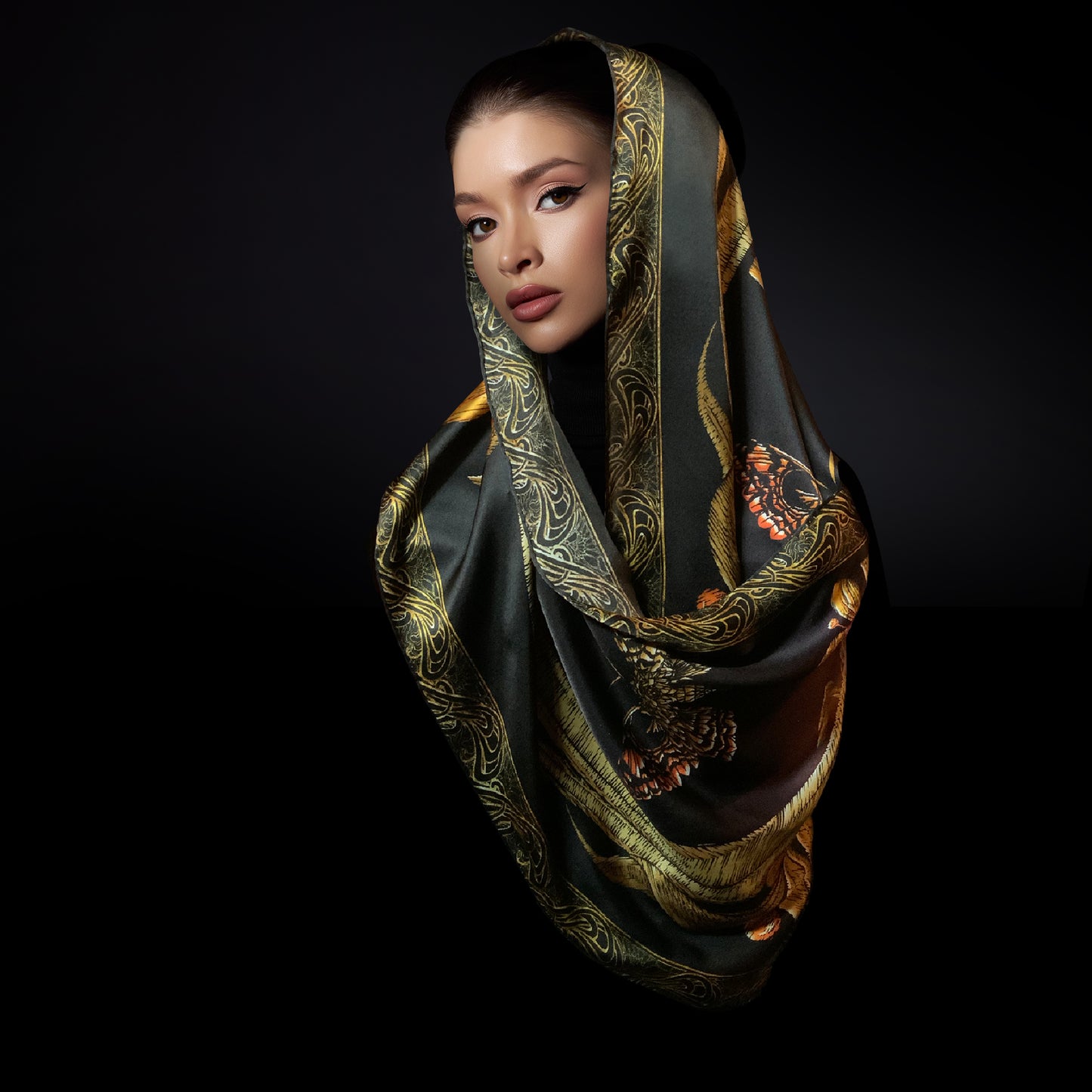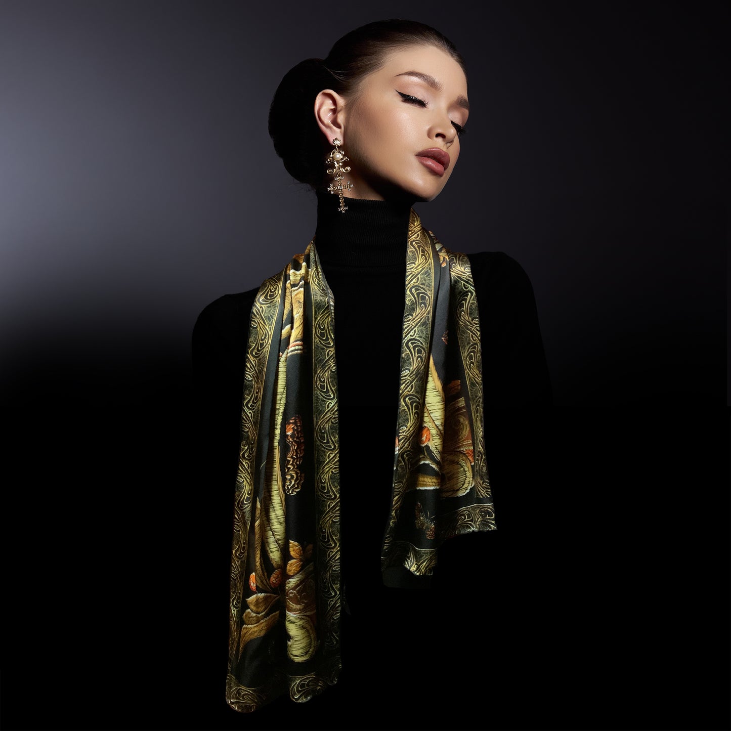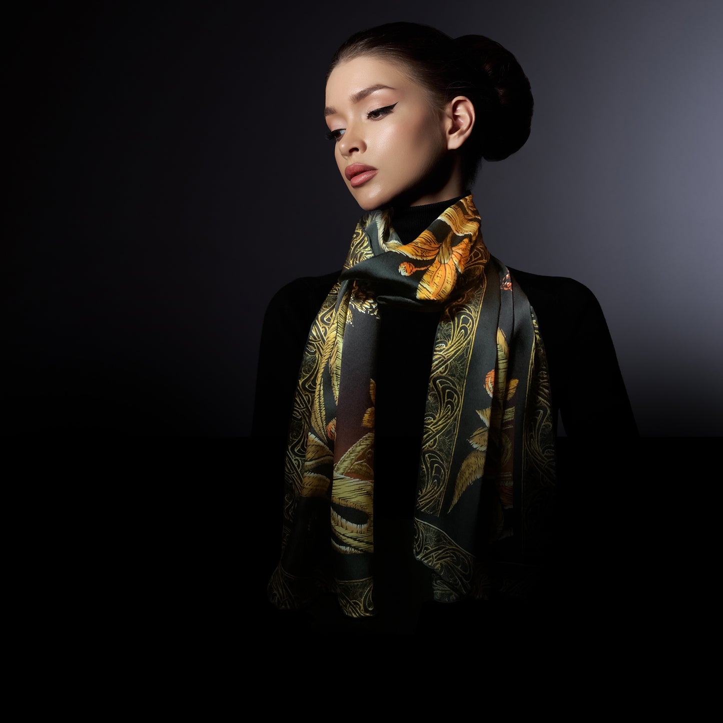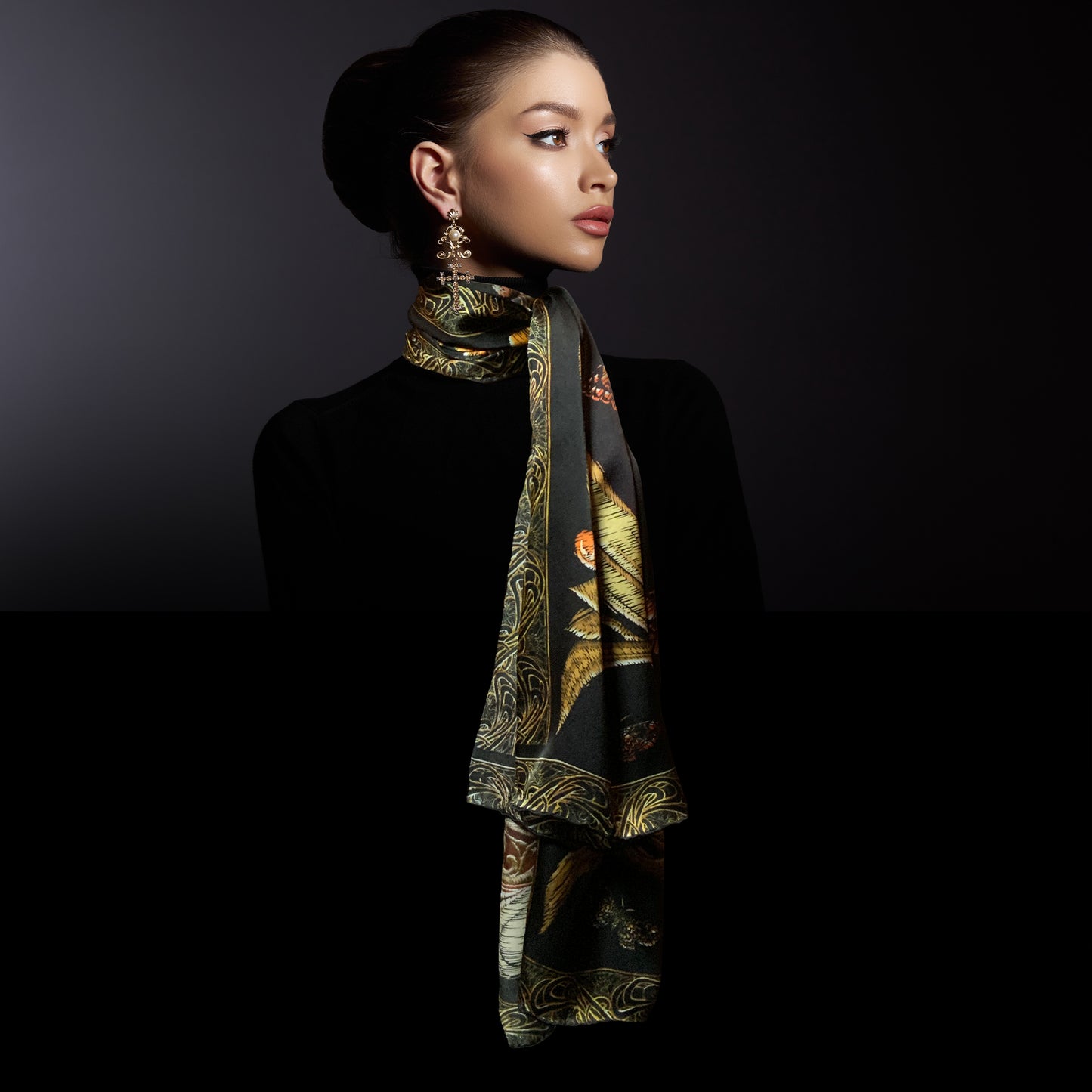 Our "Cloduis" Silk Satin Scarf features flowers and butterflies enhanced with a stitched effect complimented by a decorative border that frames the design. It is set against a black background.