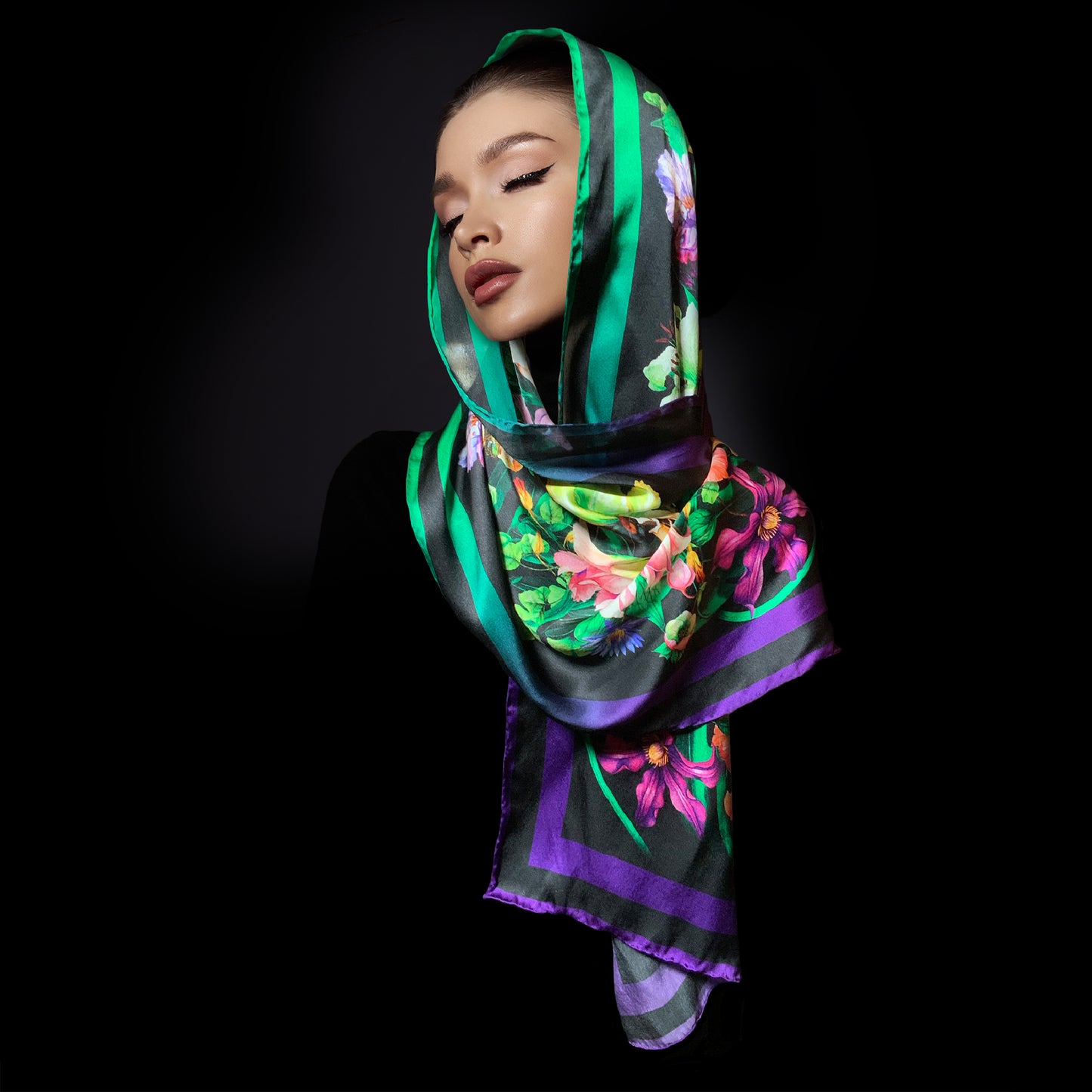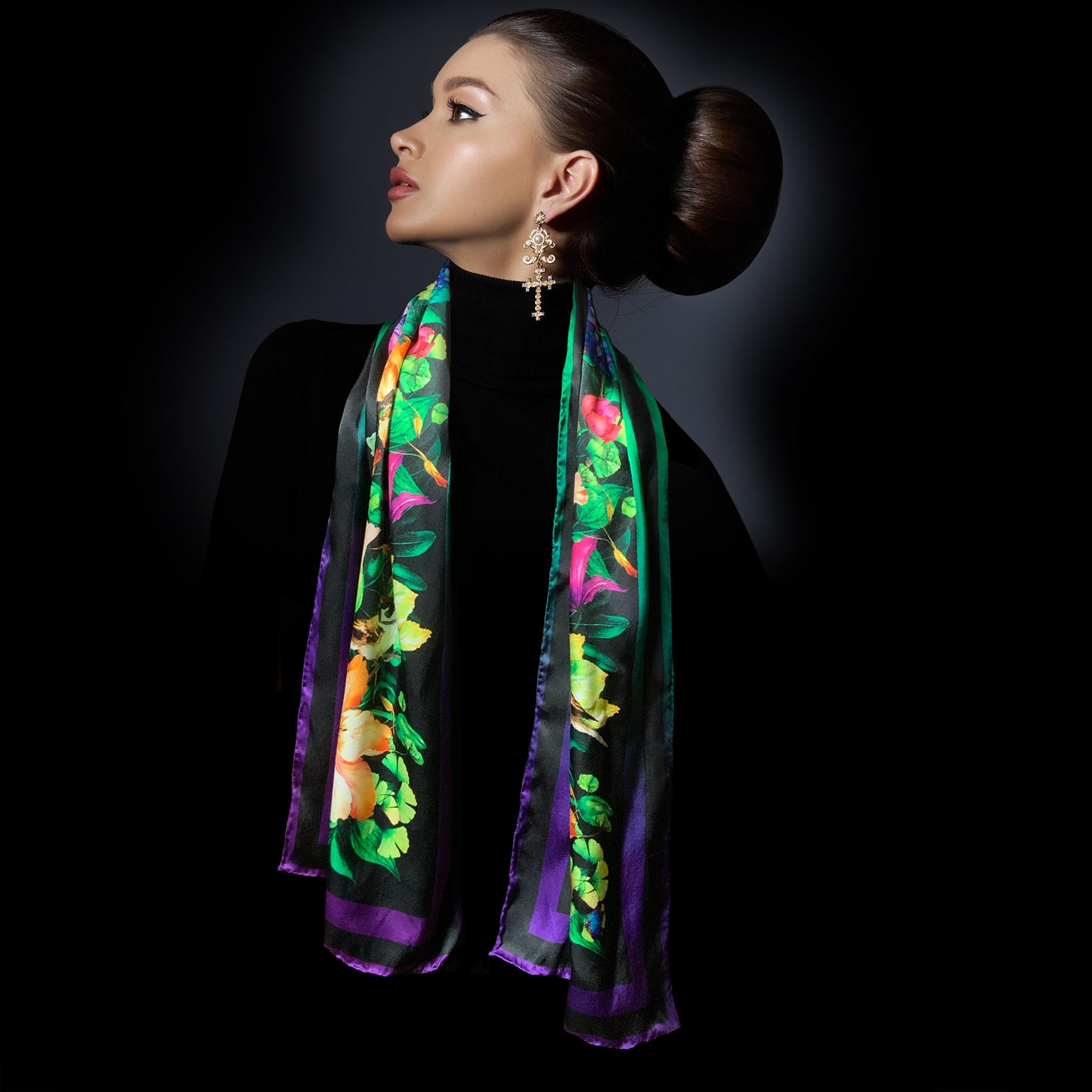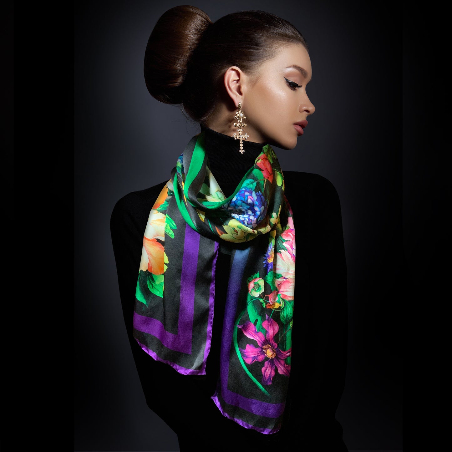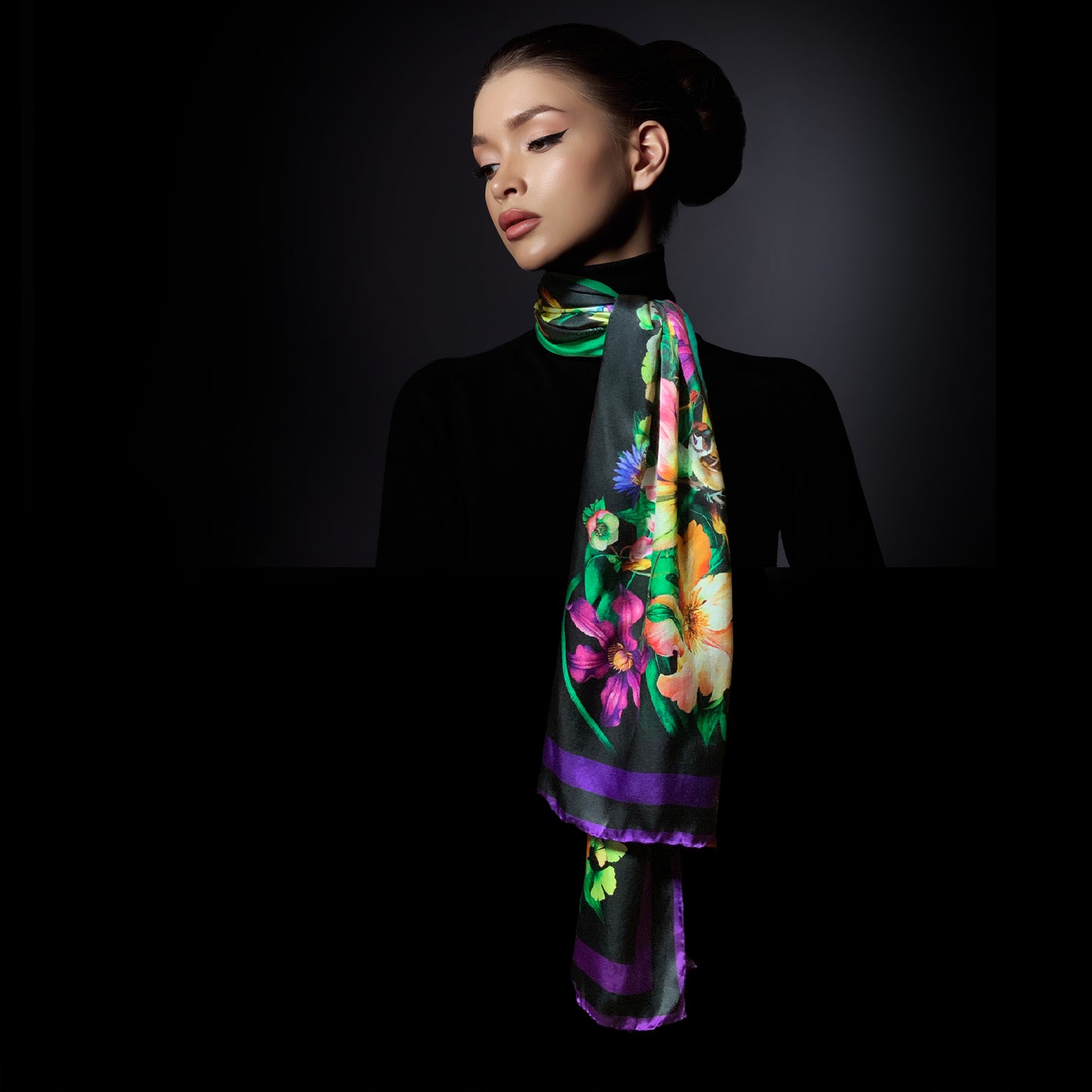 "From the Garden" Silk Satin Scarf is a beautiful vibrant spray of flowers highlighted with green and purple hues accenting the entire border. The design is set against a black background.