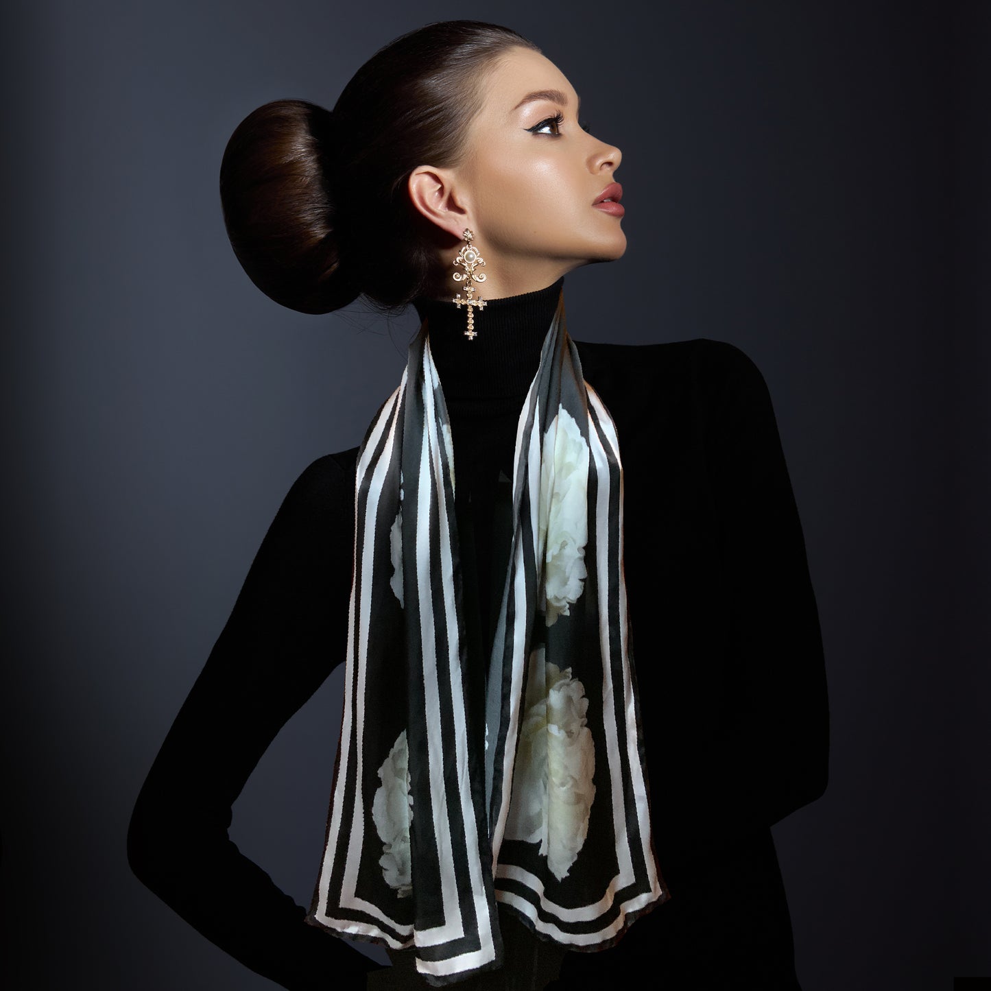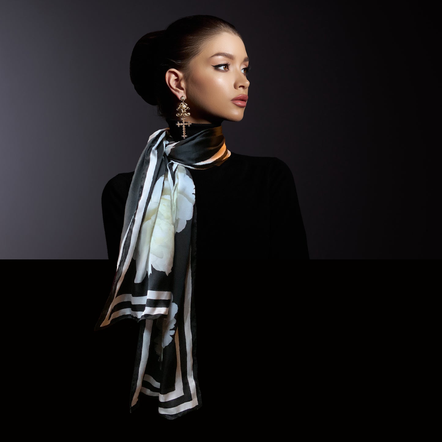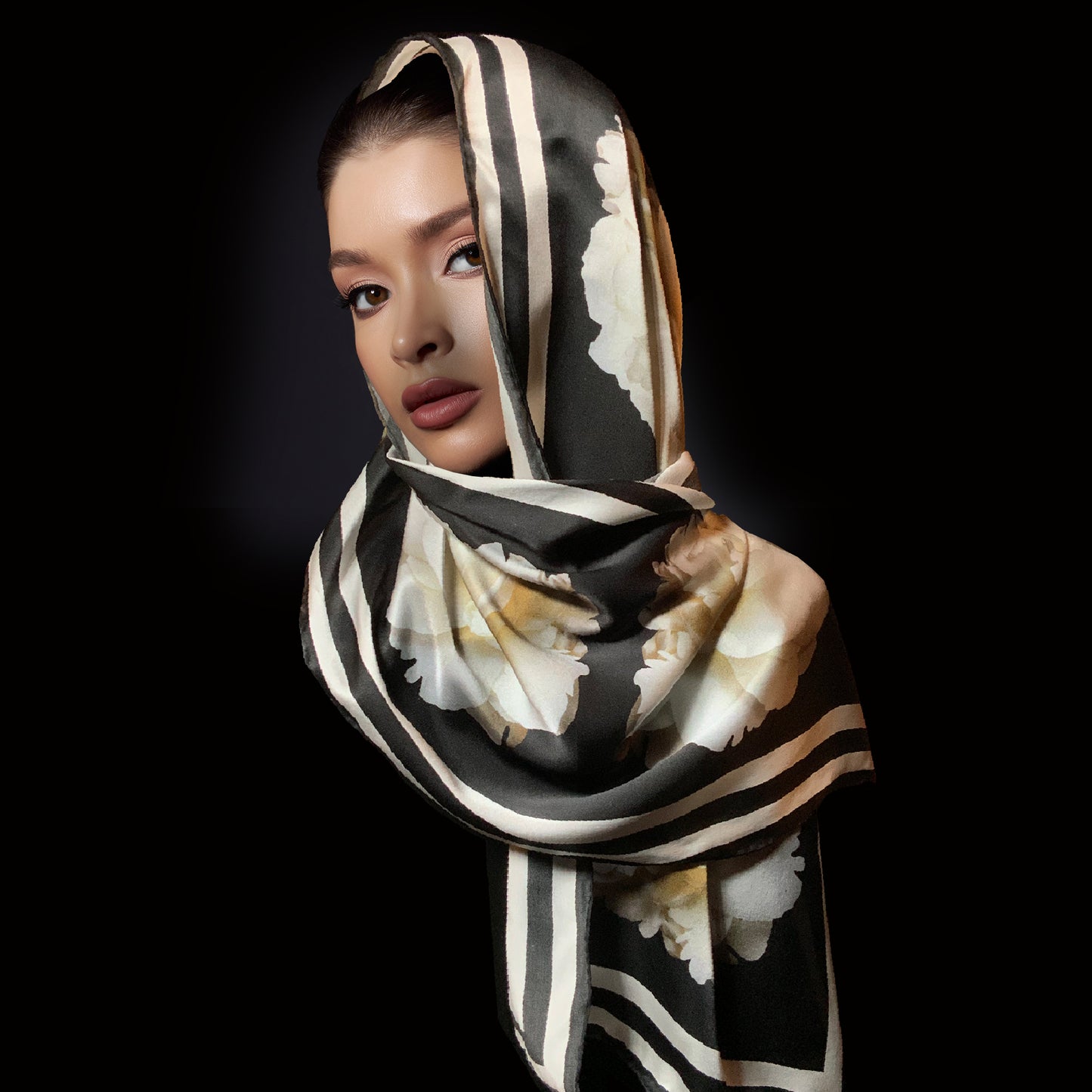 "Peony Heaven" Silk Satin Scarf is a real statement piece, featuring the timeless elegance of soft peonies graduating to a striking border of black and white stripes.