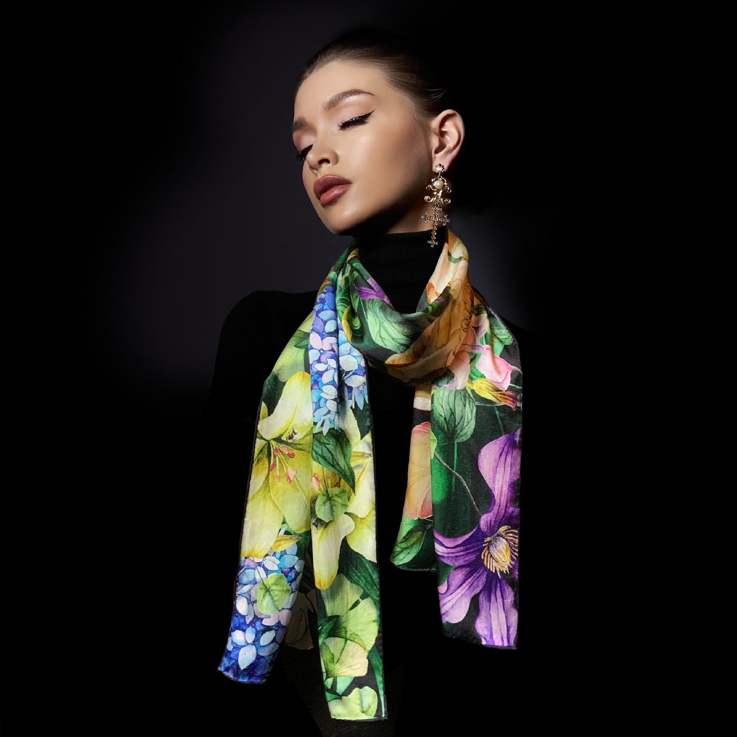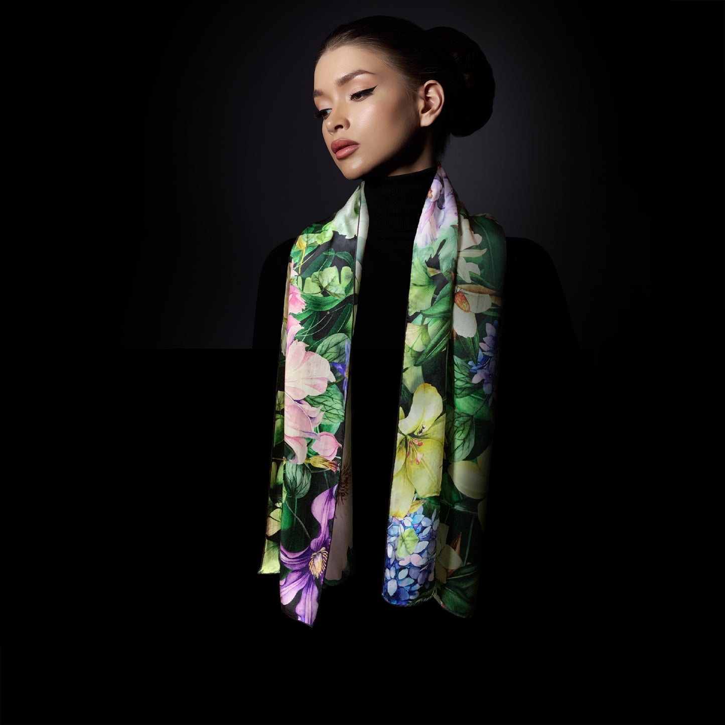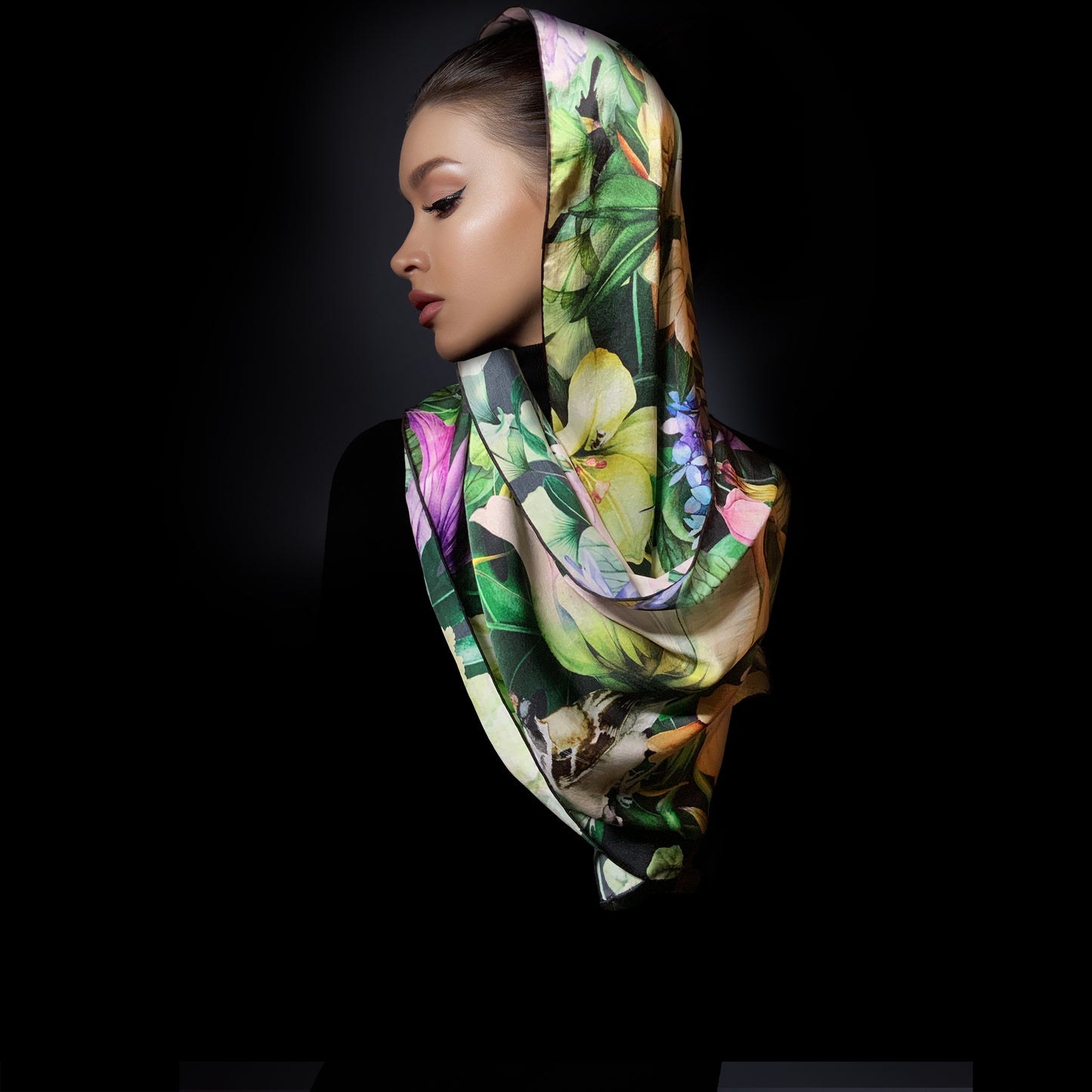 The "Tropical Splash" Silk Satin Scarf features an explosion of floral delight on a rich dark green background.