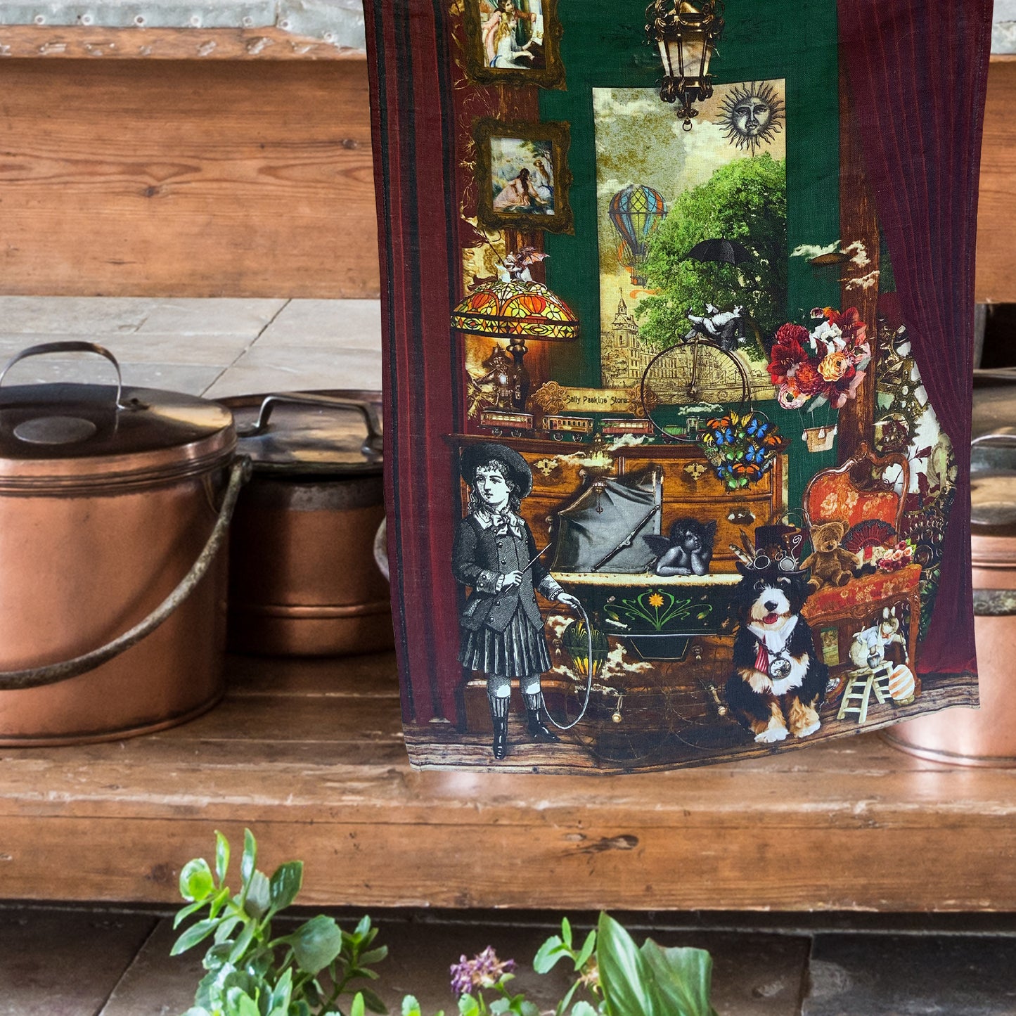 "Bessies Bedroom " Linen tea towel is a snapshot of a child's fun filled world of toys and color.