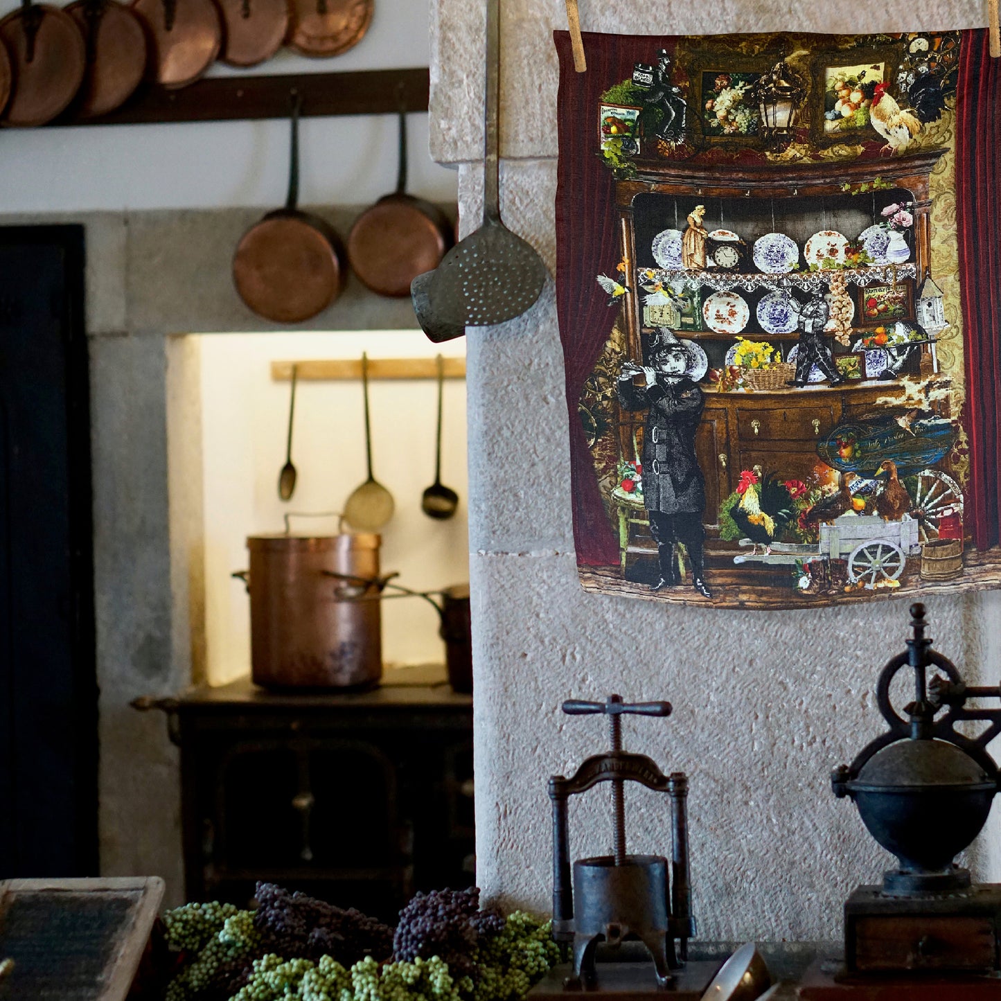 Our "Kitchen Melodies" Linen Tea Towel depicts the young master of the house playing his musical melody that signals to his friends it’s safe to come out and play.