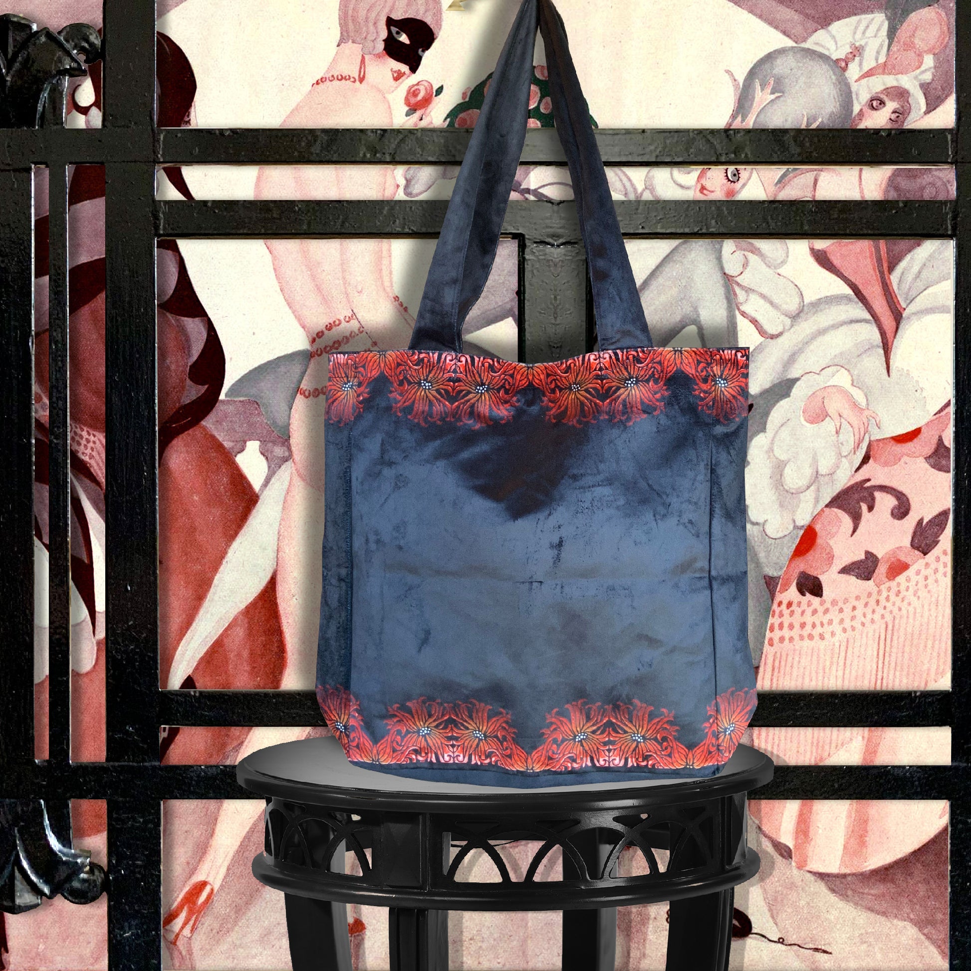 Sally's "Moderne" velvet bag is crafted from rich soft black velvet and framed with vivid red lily motifs that bloom across the top and bottom borders. The design is both dramatic and elegant, capturing a sense of bold artistry. On one side, the pattern flows as a continuous border of lilies, while the reverse reveals an added layer of detail - geometric diamond motifs entwined with the lilies, lending an Art Deco - inspired symmetry. The long velvet straps provide comfort and ease for carrying, making it both a practical and standout piece.
