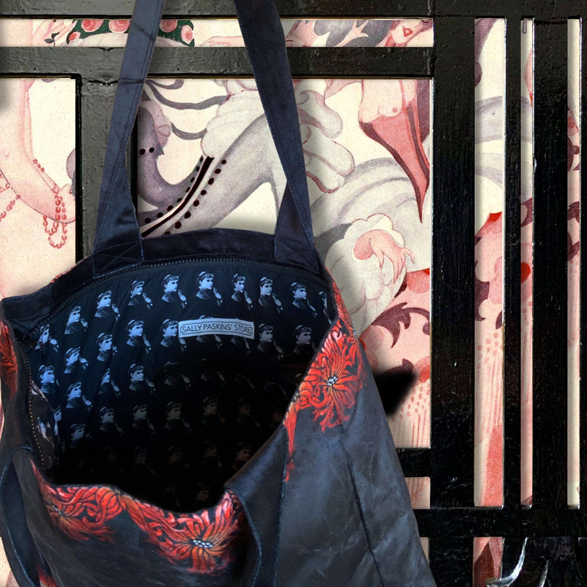 Inside, the Sally Paskins signature lining transforms the interior into a conversation piece of its own - patterned with vintage-style portraits that add depth and character. A discreet zip pocket offers practicality, while the long velvet straps ensure comfort for everyday wear.