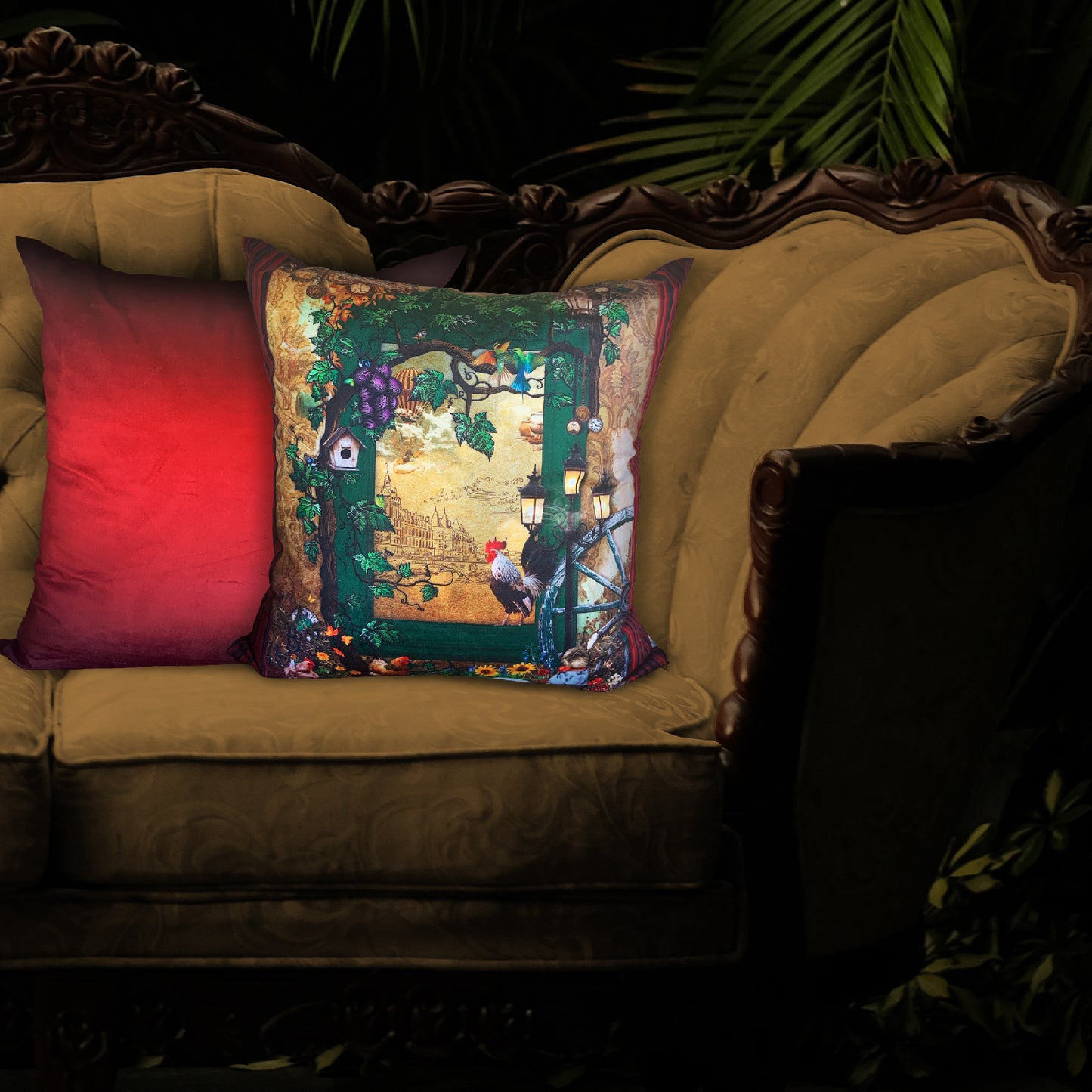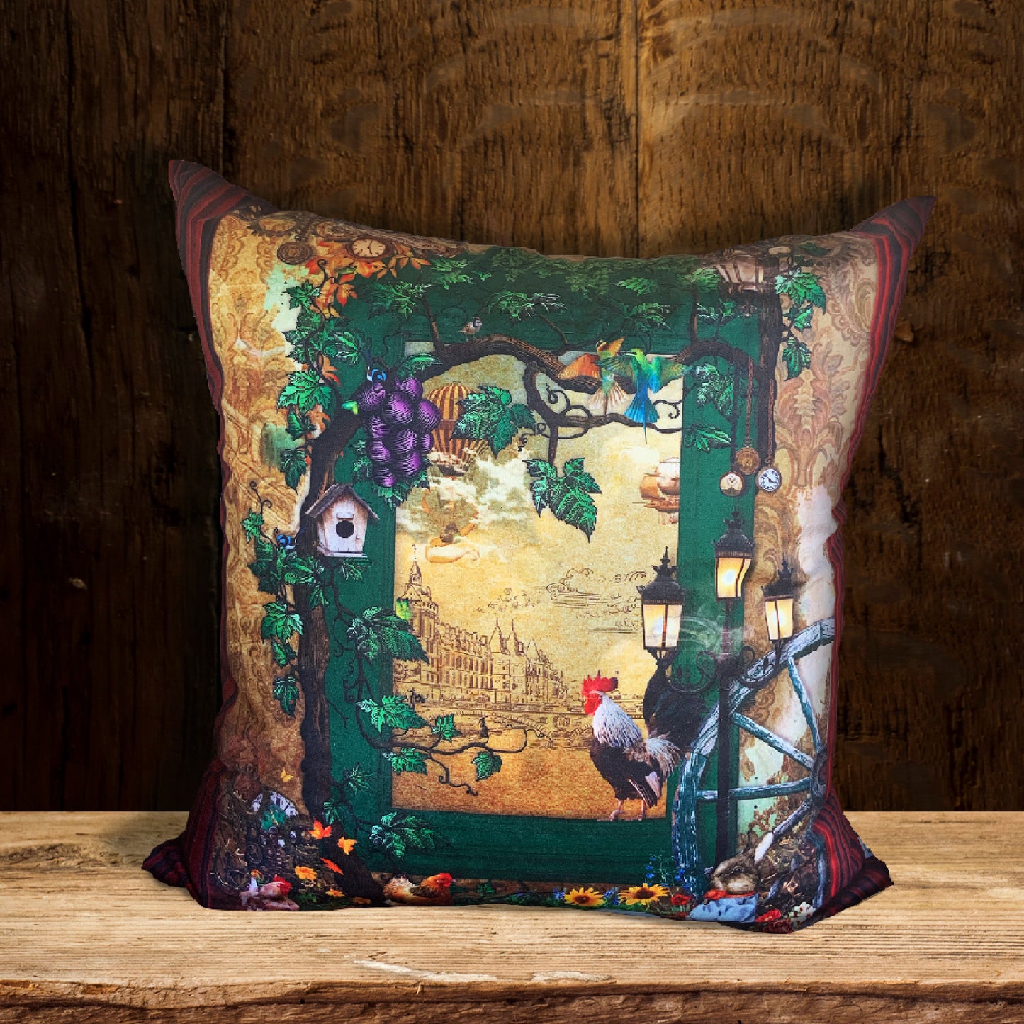 Our "Morning Time" Velvet Cushion is very opulent and one of our most popular designs. It features a steampunk theme through the window, with a rooster welcoming the break of day.