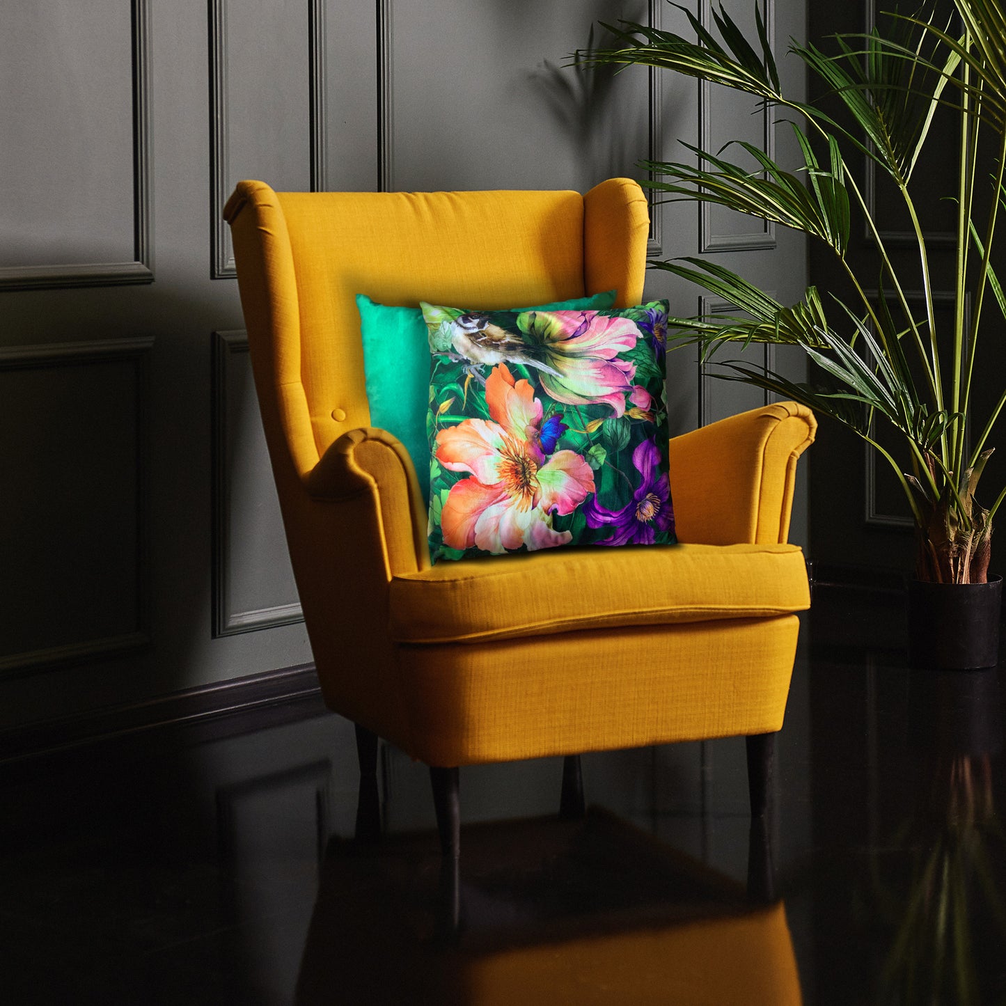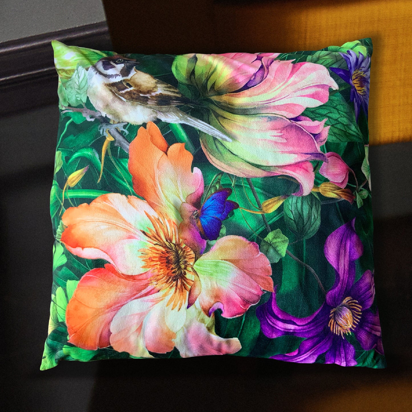 Our "Sparrow Delight" Velvet Cushion is one of five designs in this contemporary range. It is bursting with colorful flowers and our sparrow perched in amongst the dark green foliage background.